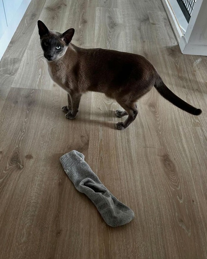 Хозяйка Лео поделилась в соцсетях, что он действует как хищник, но при этом не просто кидает добычу — он остаётся безмолвным, кладёт её на пол и идёт за новой, словно любит азарт охоты сам по себе.