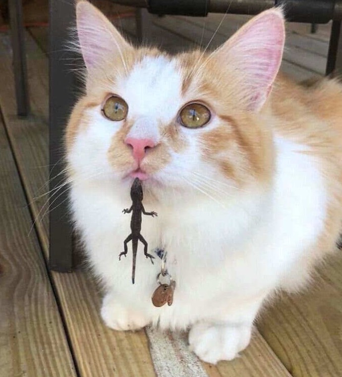 Возможно, кот решил заняться экзотической кулинарией, но ящерица явно не собирается быть блюдом дня. Теперь выглядит так, будто кот обзавёлся оригинальным пирсингом. Надеемся, для всех участников этой истории всё закончилось благополучно.