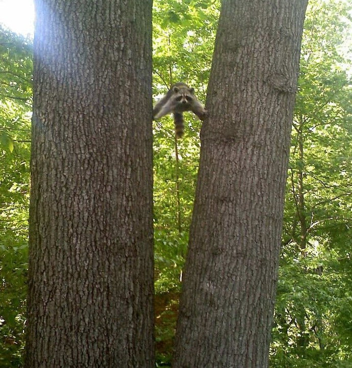 Этот енот явно переоценил свои спортивные способности и застрял в воздухе между двумя деревьями. Теперь он задумчиво висит, размышляя о своих жизненных решениях. Возможно, стоит пересмотреть карьеру каскадёра.