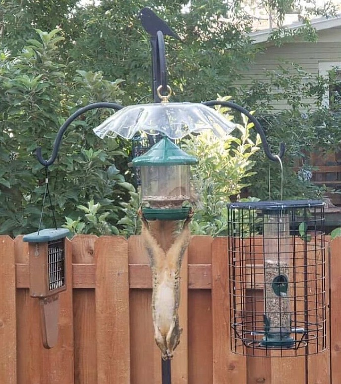 Белка продемонстрировала потрясающие навыки акробатики, лишь бы добраться до семечек. Глядя на её позу, можно подумать, что это секретный агент из беличьей разведки. Интересно, долго ли она сможет удержаться?