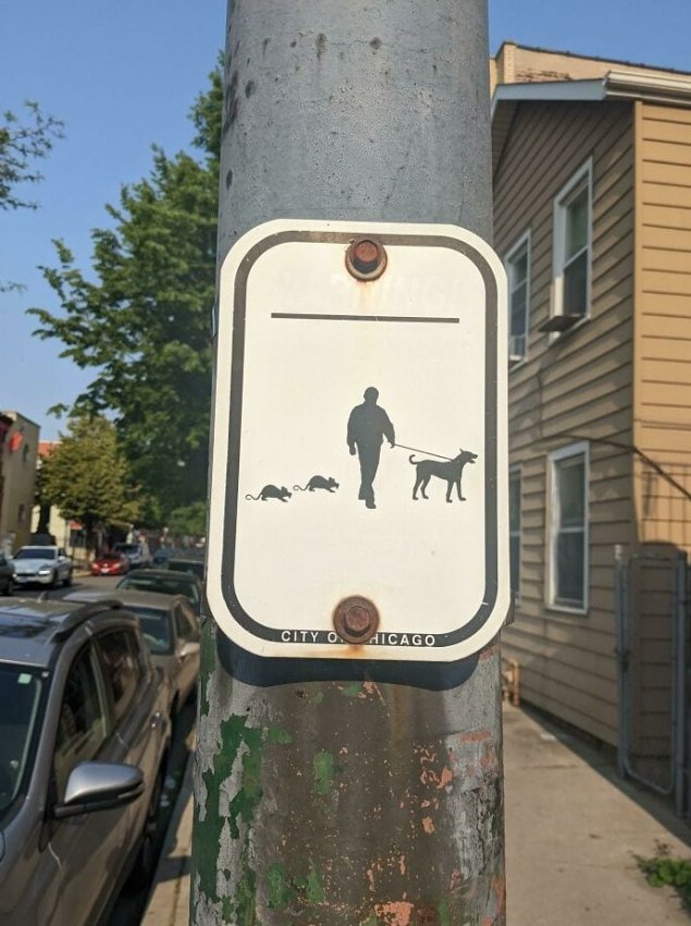 Это знак, призывающий владельцев домашних животных убирать за своими экскрементами, так как крысы их поедают.