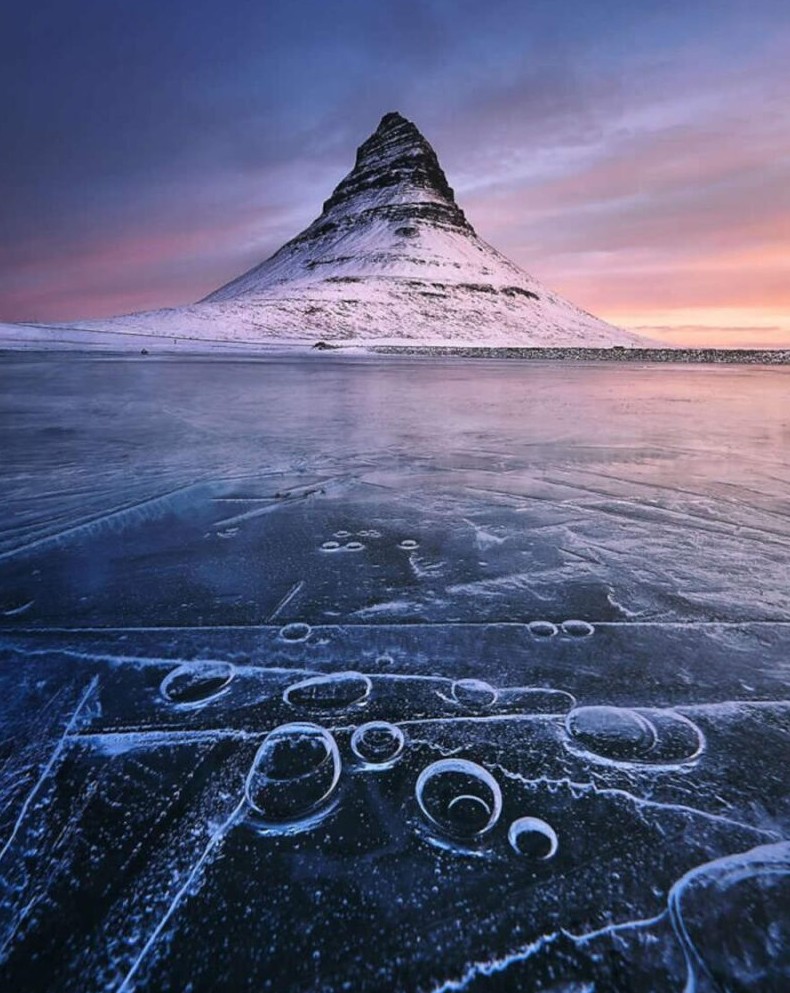 Пирамидальная вершина держит небо на кончике, у ног — стекло льда с круглыми «часами» воздуха. Кажется, что подо льдом замерла карта чужого дыхания. Сумерки подкрашивают горизонт в пастельные обещания. Тишина здесь звучит громче ветра.