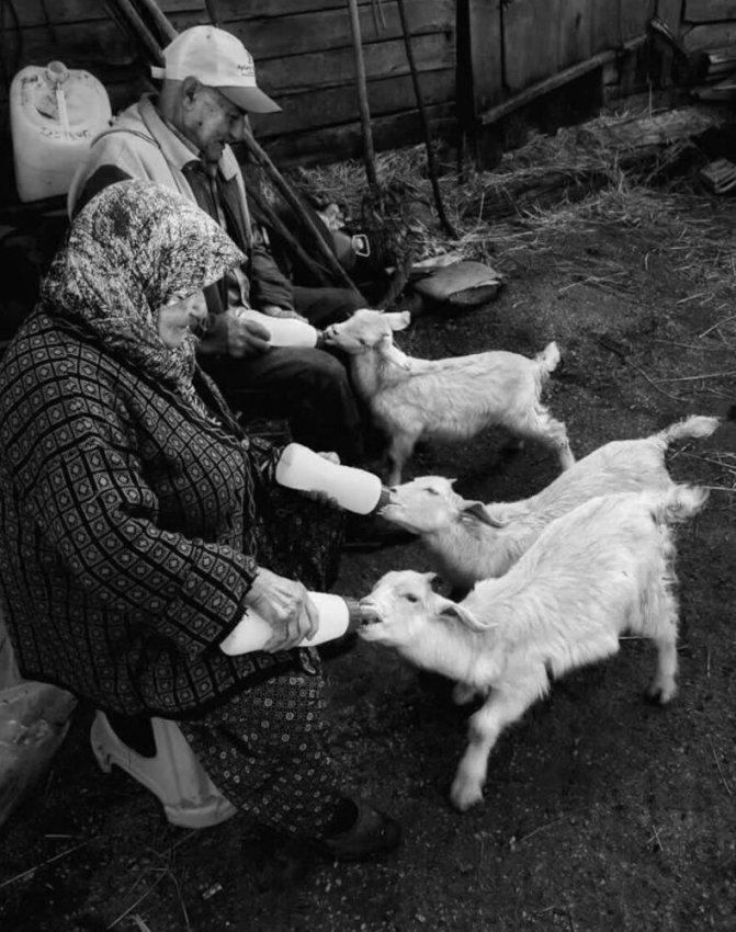 Семейный подряд: он держит улыбку, она держит ритм, козлята держат курс на обед. В этом дворе нет Wi-Fi, но связь идеальная — от ладони к мордочке. Секрет прост: молоко тёплое, шутки добрые, день идёт правильно.