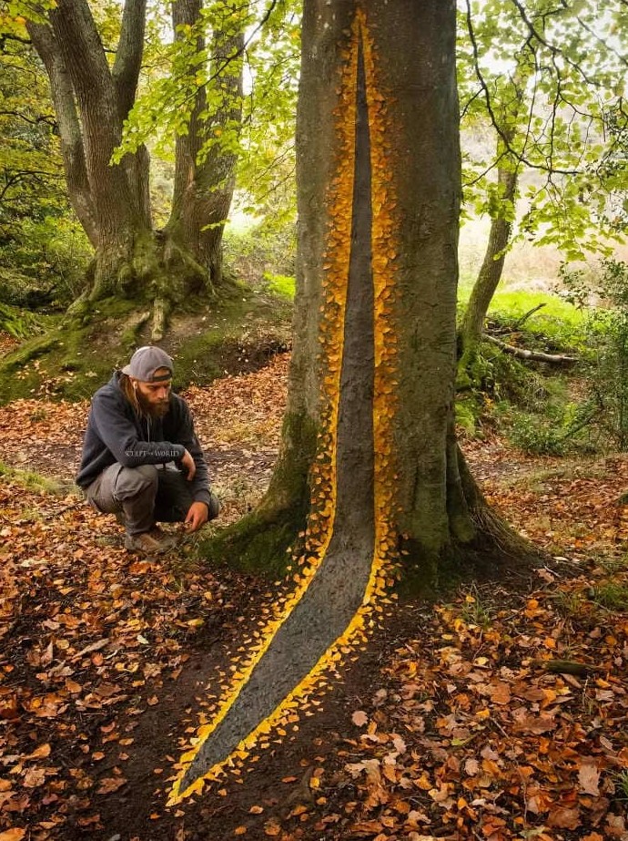 Жёлтая дорожка листьев рассекает ствол и землю, будто лес поймали в момент удара. Это не рана, а аккуратный шов, заштопанный осенью. Смотришь дольше — и видишь, как трещина уводит взгляд вглубь леса. Ветер взлетит — и молния рассыплется в мягкий ковёр.