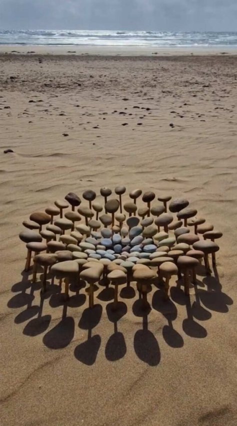 Круг камней поднят на тонких ножках, и полуденное солнце рисует под ним чёткие «лепестки». Издалека это похоже на цветок, распустившийся прямо на песке. Ещё шаг — и видишь, что это чистая игра света и высоты. Первый прилив превратит сад в ровную дюну.