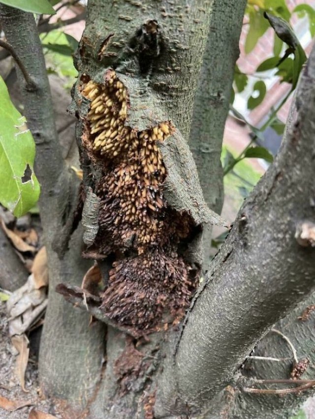 Дятел-кладовщик превратил дерево в многоэтажный склад желудей. Каждая дырочка — персональная ячейка, всё по учёту. Перфорация выполнена в промышленных масштабах и с отменным вкусом. Натуральная точечная архитектура.