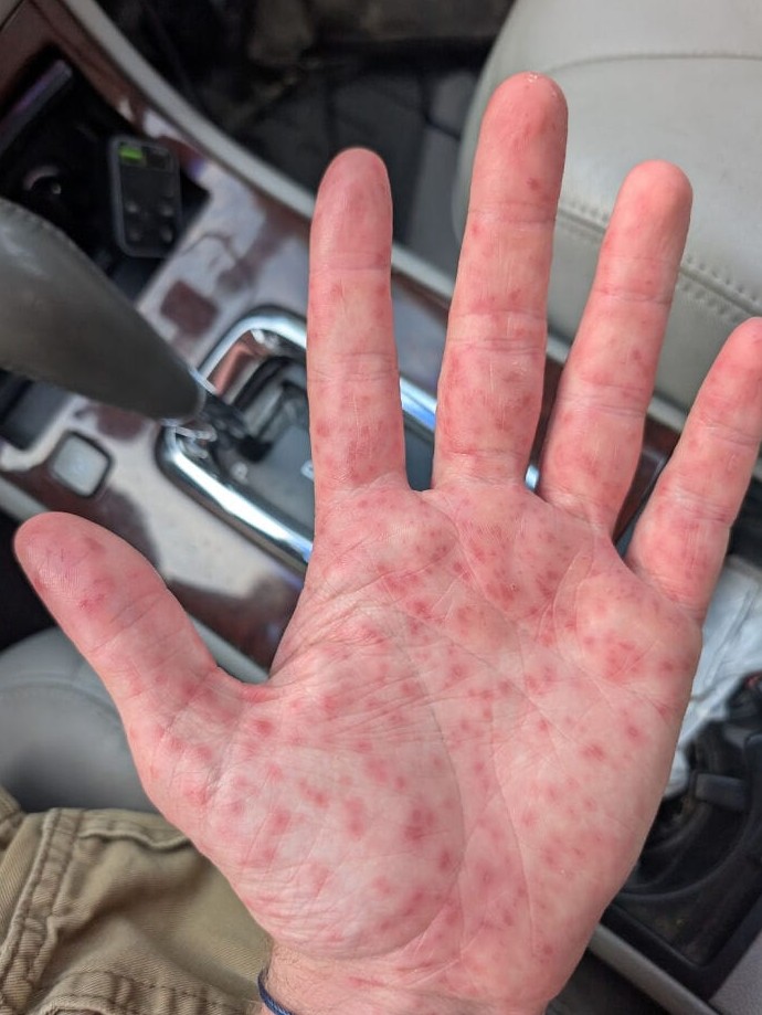Ладонь как карта ночного неба: вместо звёзд — крошечные рубиновые точки. Узор распределён почти равномерно, будто кто-то прошёлся по коже мягкой кистью. У каждой точки свой «паспорт», а вместе они создают пунктирный орнамент. Трипо-радар у чувствительных тут чуть слышно гудит.