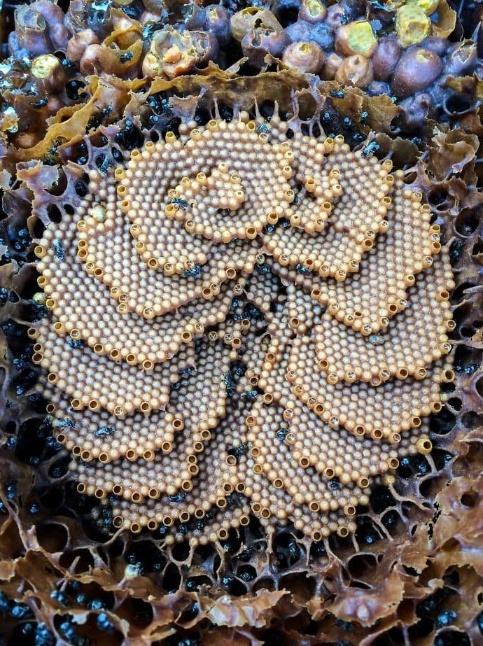 Пчёлы вышили розетку из крошечных «бусин» — идеальные круги складываются в спирали. Чем дольше смотришь, тем явственнее слышен их метрон?m труда. Это и украшение, и механизм: красота, которая работает. Глаз ловит ритм и не хочет отпускать.