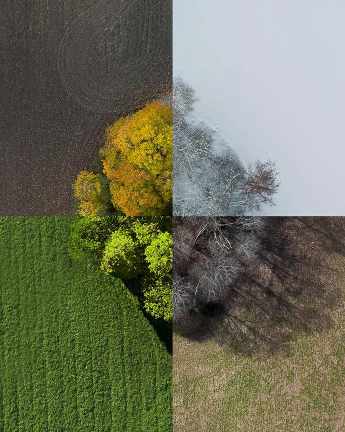Один кадр — как календарь: весна, лето, осень и зима делят поле на ровные квадранты. Дерево в центре — стрелка времени, что поворачивается без спешки. Дрон поднялся — и мы увидели, как год укладывается в идеальную диаграмму. Красота математики и природы в одной картинке.