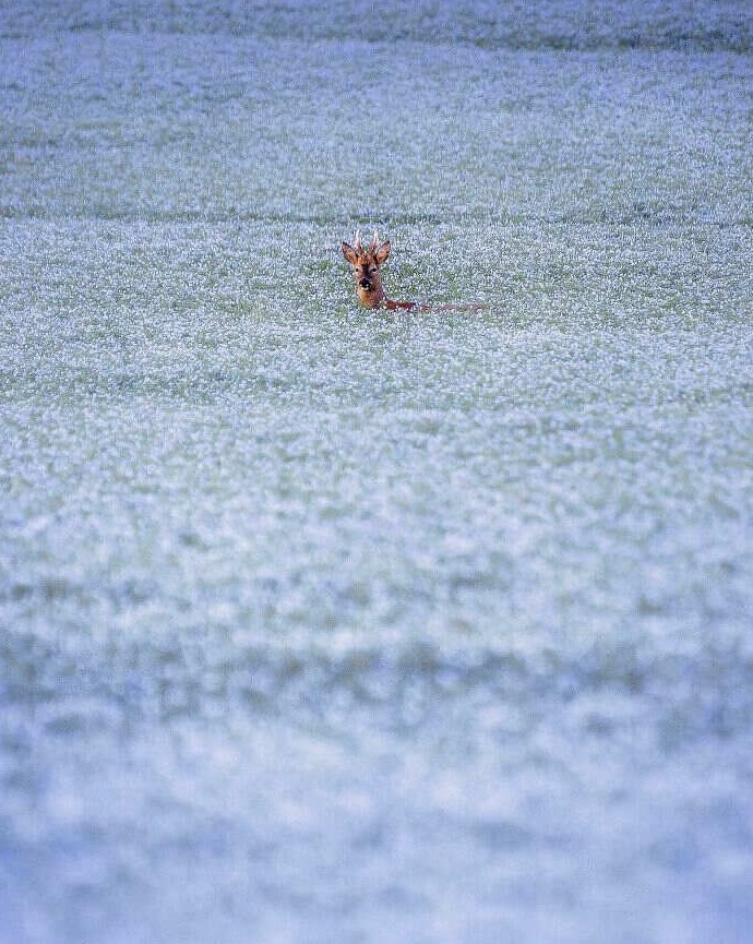 Олень плывёт по бескрайнему океану инея — капитан ледяного моря. Видна лишь голова, словно перископ любопытства. Ещё шаг — и волна шёпотом вернёт поле в идеальную гладь.
