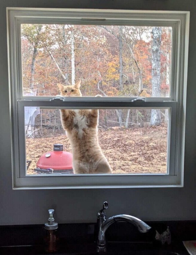 Забыл ключи и вернулся через окно — классика жанра. Стоит на подоконнике, как опытный альпинист, и стучит лапами: «Открой, у меня важное мурчательное дело!». Сопротивляться этому виду не рекомендовано.