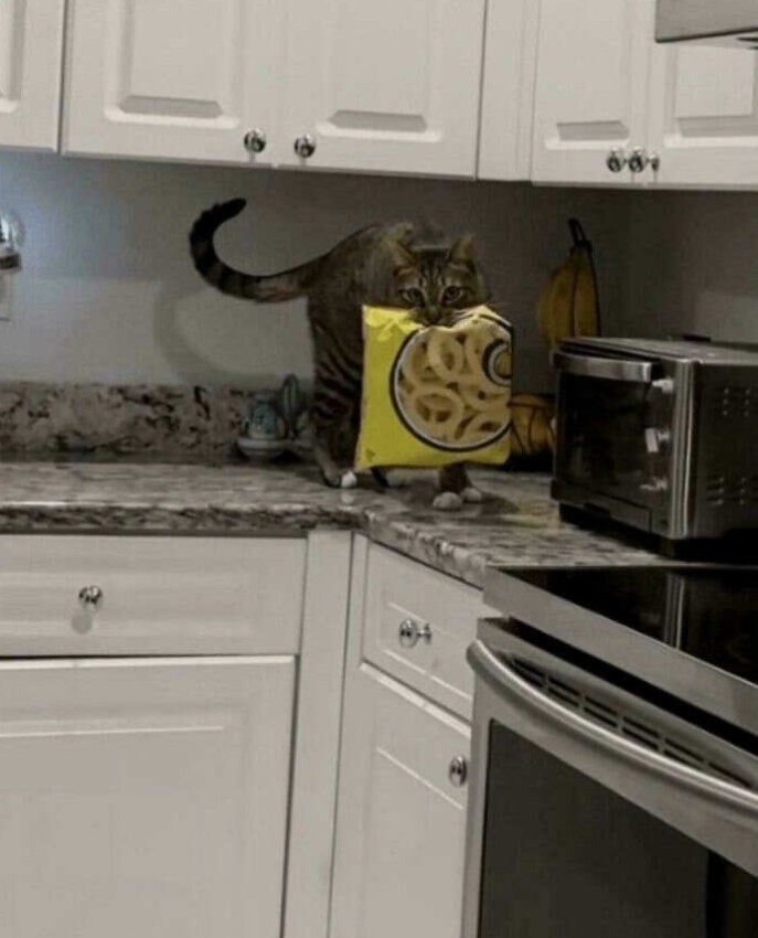 Налёт на кладовую прошёл успешно: похищен крупный пакет колец. Подозреваемый двигается тихо, как холодильник ночью. План побега прост — съесть улику по дороге. Запах сыра выдаёт только счастливые усы.