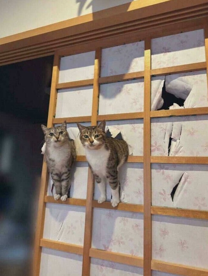 Бумажные двери не выдержали допроса. Два «альпиниста» демонстративно зависли на перекладинах и делают вид, что так и было задумано дизайнерами. Виновных не найти: левая лапа — «не я», правая — «не помню». Следствию остаётся лишь заклеить улики скотчем.