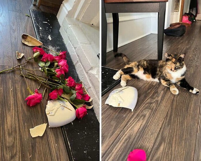 Розы освобождены из керамического плена, осколки — как салют победителю. Главная фигурантка спокойно позирует на месте преступления. Штраф — почесать пузико и вынести веник.