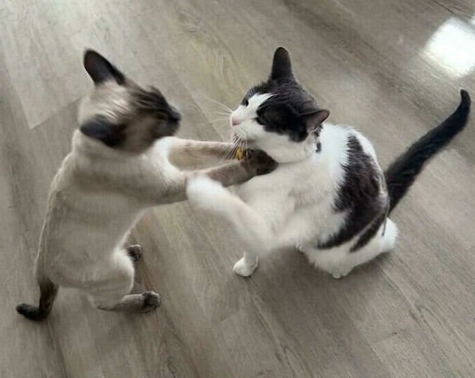 Вопрос «чья миска?» перешёл в стадию лапоприкладства. Рефери — пылесос — уже прогрел мотор. Через пять минут оба напишут мировую — на одном пледе.