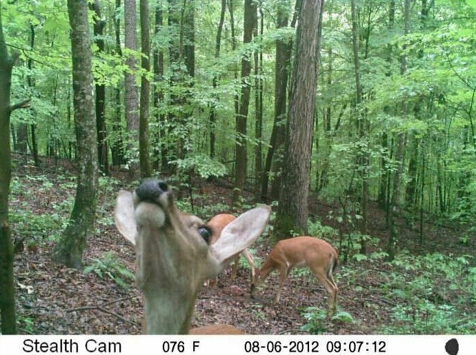 Олень задрал нос и ловит все ароматы леса, а компания на заднем плане продолжает бранч. У каждого свои приоритеты: кто-то ест, кто-то нюхает. Камера же наслаждается натюрмортом из ушей и деревьев.