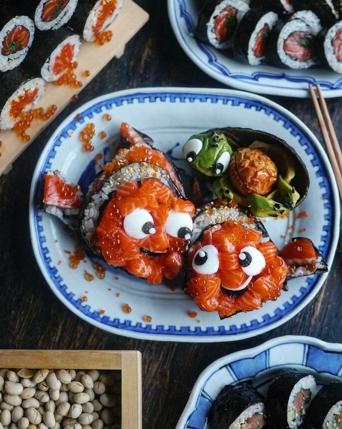 Лосось и икра превращаются в самых обаятельных обитателей океана — и хочется не есть, а беседовать. Рядом выглядывают любознательные «черепашки» из овощей и нори. Настолько живо, что рука тянется за палочками, а совесть шепчет: «Подождём ещё минутку».