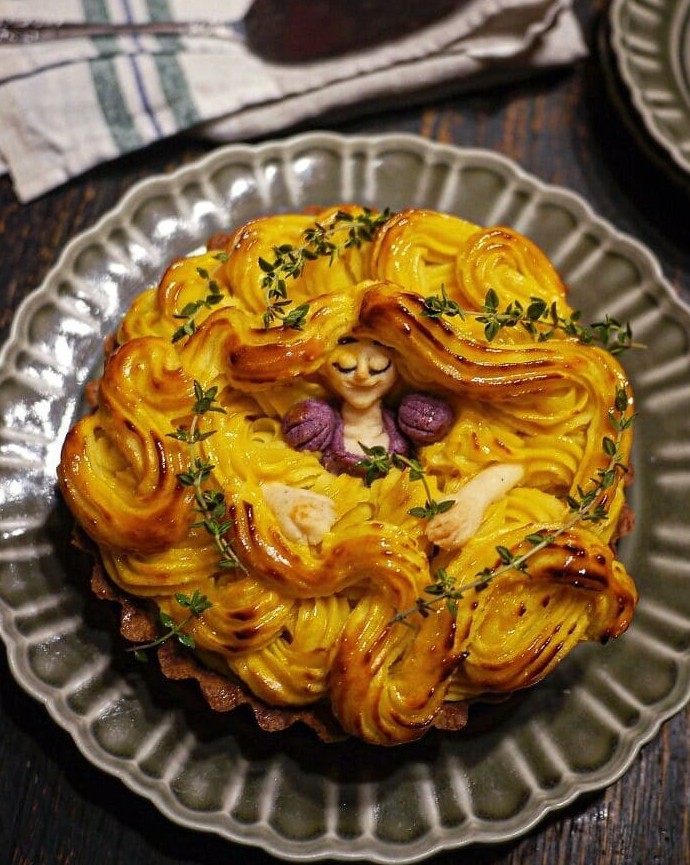 Золотистые завитки пюре образуют целое море волос — прямо поверх нежной тарталетки. Рапунцель будто дремлет в ароматном тимьяне, не подозревая, что её сказка вот-вот станет ужином. Здесь и сказка, и уют, и идеальная корочка. Съесть такую косу — одно удовольствие.