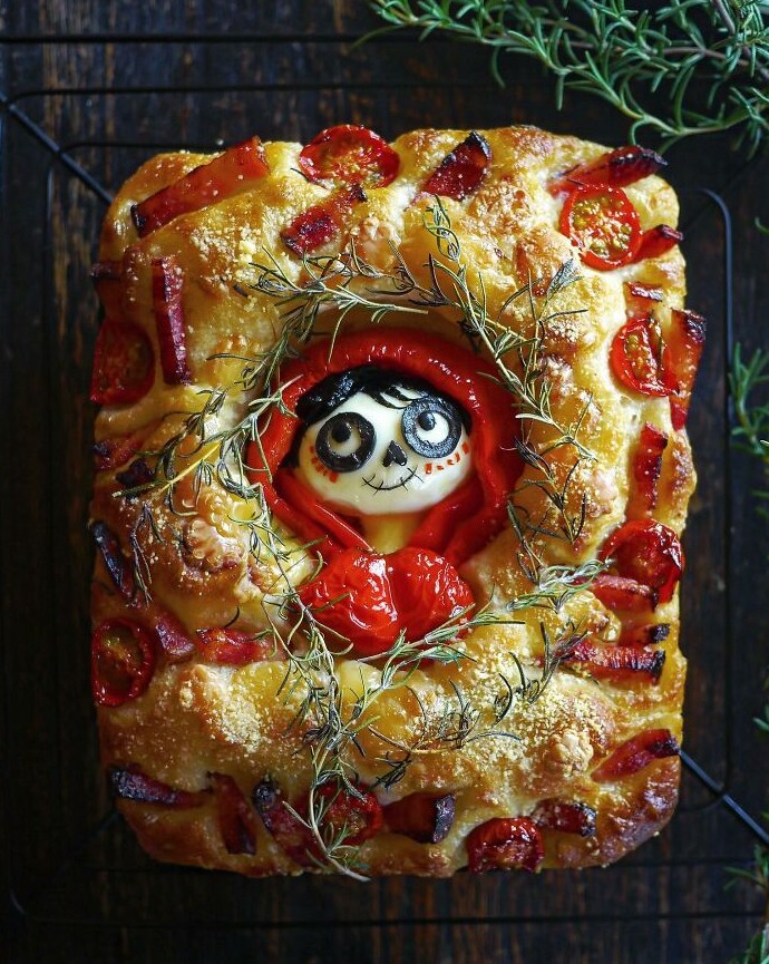 В центре ароматной фокаччи выглядывает герой в стиле D?a de los Muertos — перцы, розмарин и томаты превратились в настоящий праздник. Корочка потрескивает, оливковое масло сияет — музыка как будто уже звучит. Это хлеб, который рассказывает историю. И финал у неё очень вкусный.