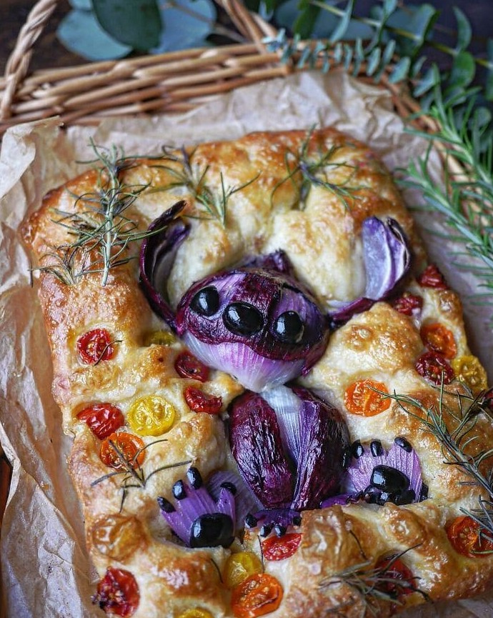 Фокачча с томатами и розмарином встречает вас очаровательным пришельцем, собранным из красного лука и маслин. Хрустящие края, мягкая середина и послание: «В нашей семье лишних кусочков не бывает». Ешьте тепло, делитесь добром.