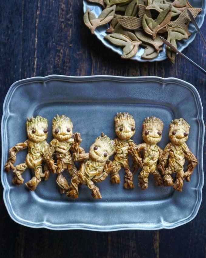 Крохотные Груты выстроились в ряд, готовые спасать галактику и аппетит. Тонкие веточки-тесто, шоколадные глазки — и вот уже на тарелке мини-отряд стражей. Их хочется сфотографировать, а потом съесть с улыбкой. Отличная закуска для киновечера.