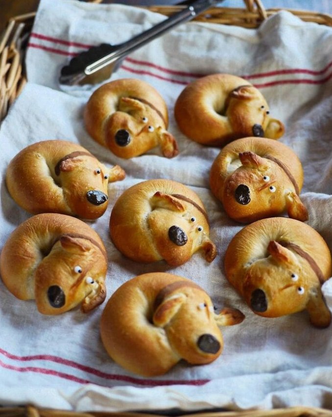 Эти бублики решили вздремнуть, свернувшись в клубочек — прямо как щенки. Изюмные носы и ушки из теста делают их неприлично милыми. Дети спорят: играть или устроить пикник? Ответ прост — и то, и другое.