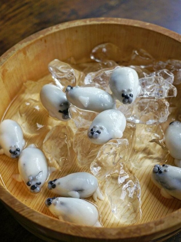 Нежные рисовые шарики превращены в пушистых тюленей и улеглись на прозрачные «айсберги». Глазки-кунжут смотрят так трогательно, что их хочется погладить ложкой. Десерт, который тает быстрее, чем вы успеете сказать «каваиии».