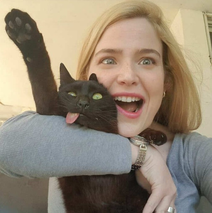 Когда пытаешься сделать милое селфи, а твой кот решает превратить его в мем! Высунутый язык, поднятая лапа и абсолютная уверенность — этот чёрный красавец точно знает, как затмить хозяйку. Девушка в восторге, кот в ударе, фото — бесценно.