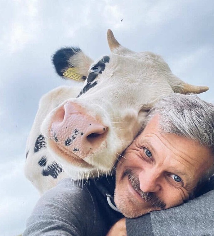 Идеальный пример того, как корова фотобомбит человеческое селфи и становится главной звездой кадра. Розовый нос крупным планом, любопытный взгляд и абсолютная уверенность — эта бурёнка точно знает, как украсть шоу. Мужчина на заднем плане даже не подозревает, что его селфи превратилось в портрет коровы.