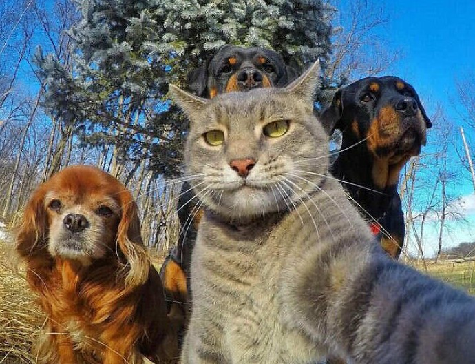 Редкий кадр мирного сосуществования кошачьих и собачьих! Кот в центре — явный лидер этой банды, который взял ситуацию под контроль и встал в самую выигрышную позицию. Две собаки на заднем плане смотрят так, будто это была идея кота, а они просто согласились участвовать.