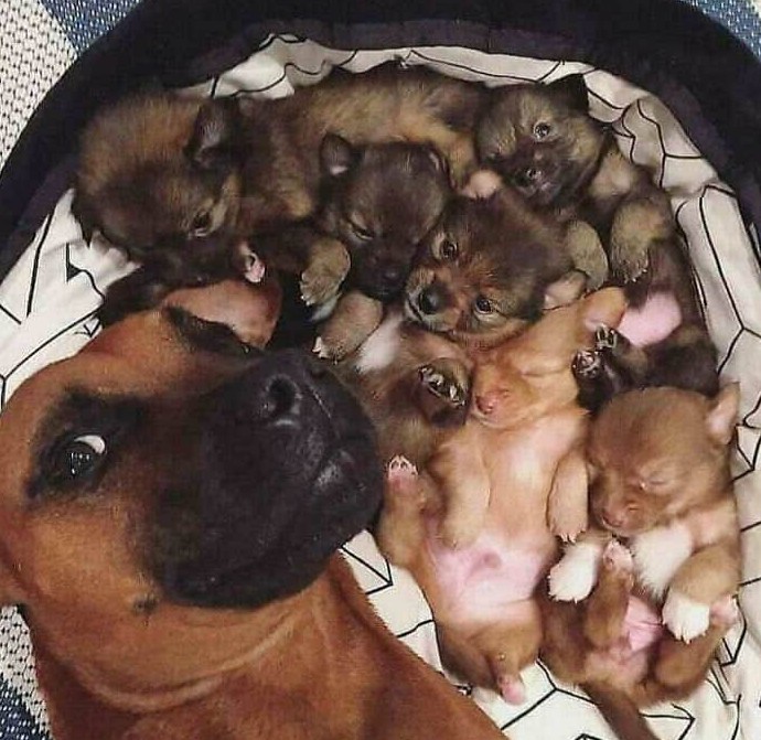 Гордая мамаша показывает своё главное достижение в жизни — целый выводок очаровательных щенков! Взгляд, полный материнской любви и лёгкой усталости, говорит сам за себя. Щенки же явно ещё не понимают, что попали в кадр, и просто наслаждаются жизнью.
