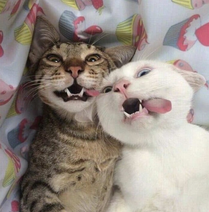 Когда пытаешься сделать милое селфи с подругой, но у обеих случается приступ безумия! Эти два кота явно решили показать свои лучшие «сумасшедшие» лица одновременно. Высунутые языки, безумные глаза и полная синхронность — идеальный кадр для мемов.