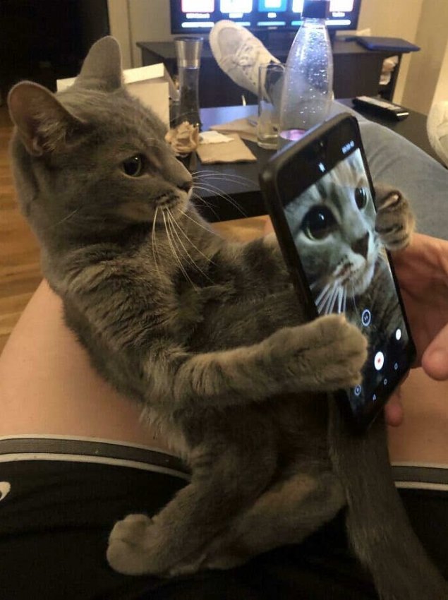 Момент, когда кот понял, что эта штука в руках хозяина показывает его морду! Сосредоточенный взгляд на экран, лапы на телефоне — это уже не случайное фото, а осознанный контроль. Следующий шаг — собственный Instagram и миллион подписчиков.