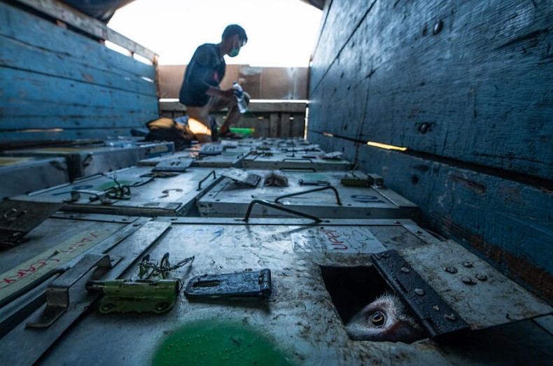 «Макака выглядывает из своей транспортной клетки, пытаясь увидеть, что происходит снаружи во время путешествия обратно в дикую природу.