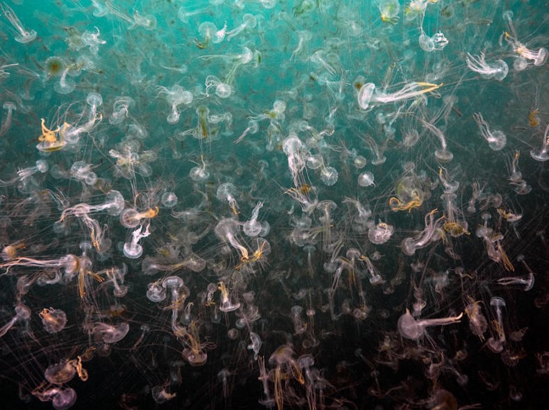 Во время погружения на коралловом рифе у острова Мисул в Индонезии я наткнулся на огромное скопление медуз семейства Pelagiidae (например, Pelagia noctiluca или Sanderia malayensis). Тысячи этих животных плыли по течению всего в нескольких метрах от рифовой стены.