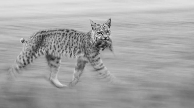Рыси, если только не находятся в состоянии стресса, обычно двигаются не очень быстро, что затрудняет панорамную съёмку. Кроме того, они редко показывают свою добычу на открытых пространствах. Чтобы получить идеальный панорамный снимок, рысь должна двигаться почти перпендикулярно объективу камеры, а мне — точно следовать её темпу. Поэтому в тот пасмурный вечер, когда мне удалось занять нужную позицию и всё прошло по плану, я был в восторге.
