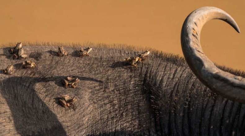 Сцена была сюрреалистической: дюжина маленьких, проворных лягушек мирно отдыхала на широкой, щетинистой спине буйвола, наполовину погруженного в воду. Это казалось сценой из сказки. В этот момент история хищника и жертвы померкла, уступив место другому повествованию, напомнившему мне «Путешествия Гулливера».