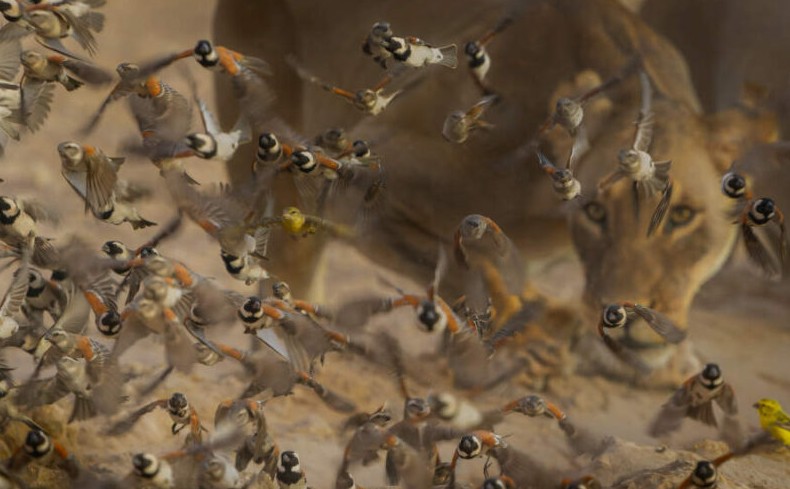 Мне посчастливилось посещать трансграничный парк Кгалагади несколько раз в год. Парк, расположенный в полузасушливом климате, может быть очень сухим, грозы случаются всего несколько раз в год. В один особенно сухой сезон мы видели, как несколько небольших птиц слетались к водопою на водопой. Однажды ранним утром нам повезло: прайд львов приблизился к водопою, пока мы стояли неподалёку. Птицы прибывали всё чаще, ненадолго садясь на воду, прежде чем взлететь. На фотографии стая взмывает в воздух, пока львица пьёт, бдительно следя за птицами, но не тревожа их. Было захватывающе наблюдать, как птицы отважно идут на риск, когда львица находилась так близко. Она оставалась бдительной и готовой отреагировать на любое движение. Мне повезло найти идеальное место, чтобы запечатлеть обоих в одном кадре, соблюдая правила парка, запрещающие езду по бездорожью.