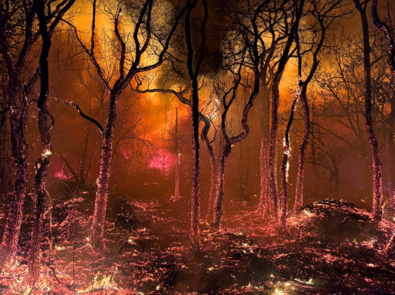На фотографии запечатлён эффект поджога – контролируемого огня, намеренно устроенного для уничтожения топлива между противопожарной полосой и фронтом приближающегося пламени, останавливая его продвижение. Хотя открытое пламя впечатляет и мощно, я намеренно искал другой ракурс: я подождал, пока фронт не продвинется глубже в лес, чтобы запечатлеть эту сцену, надеясь создать иную, гипнотическую атмосферу. Преображающая сила огня очевидна в пейзаже, который он оставляет после себя: раскалённые поленья, покрытые угольками, и искривлённые ветви создают завораживающую красоту, способную увлечь зрителя.
