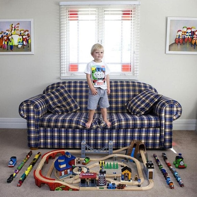 Когда вся комната превращается в железнодорожную станцию! Этот юный машинист из благополучной семьи собрал внушительную коллекцию поездов и вагонов. Каждый элемент деревянной железной дороги занял своё место на ковре, а сам владелец гордо позирует на диване. Судя по количеству техники, родители явно поддерживают его транспортные увлечения.