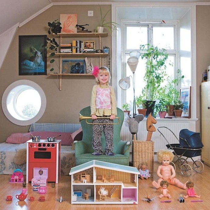 Европейский минимализм и экологичность! Деревянный кукольный домик, винтажная коляска, красная игрушечная плита и несколько кукол в уютной скандинавской комнате. Круглое окно-иллюминатор и обилие растений создают атмосферу осознанного родительства. Эта девочка растёт в мире, где игрушки выбирают не по количеству, а по качеству и экологичности. Каждая вещь здесь — с душой и историей, а не массовый ширпотреб из пластика.