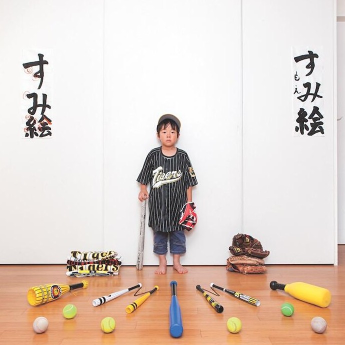 Профессиональная форма, биты, мячи и перчатки — этот парень серьёзно настроен на бейсбол! Иероглифы на стене намекают на японское происхождение юного спортсмена. Коллекция бит разных размеров и цветов выстроена веером на полу. Красная перчатка в руке — явно не просто игрушка, а настоящая экипировка. Родители явно вкладываются в спортивное будущее сына!
