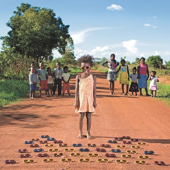 Это та самая история, о которой рассказывал фотограф! Коробка солнцезащитных очков, упавшая с грузовика, стала главным сокровищем для детей из замбийской деревни. Десятки разноцветных очков аккуратно разложены на красной земле — это и игрушка, и валюта для игры в рынок одновременно. Девочка позирует перед своими друзьями, которые с интересом наблюдают за фотосессией. В месте, где нет ни электричества, ни магазинов, дети превратили случайную находку в бесконечный источник радости.