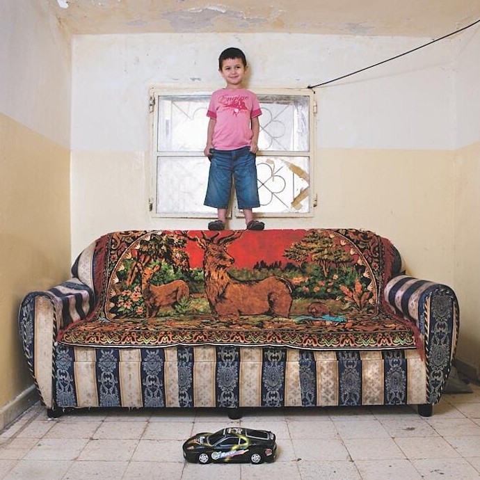 Одна-единственная полицейская машинка — и больше ничего. Этот мальчик стоит на потрёпанном диване с гордостью победителя, ведь у него есть своя игрушка. Облупившиеся стены и старая мебель контрастируют с его счастливым лицом. Когда у тебя всего одна машинка, она становится самой лучшей машинкой в мире.