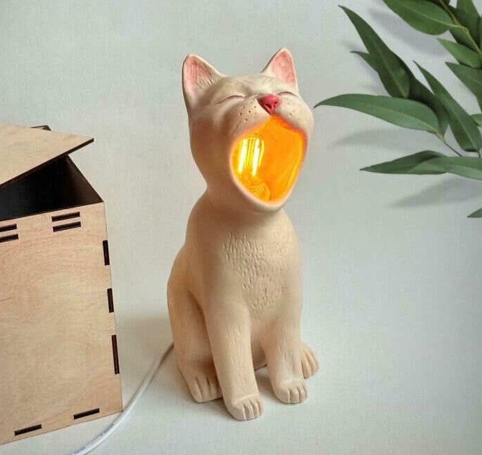 Я сделал эту керамическую лампу в форме зевающей кошки. Она должна вызывать сонливость