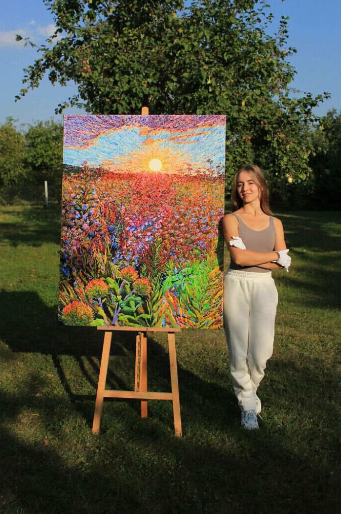 Этот взрыв красок доказывает, что иногда «слишком много цвета» — это именно то, что нужно! Художница создала импрессионистический пейзаж, где каждый мазок пульсирует энергией, а цветочное поле буквально светится под закатным небом. Техника напоминает пуантилизм, но с более свободным и экспрессивным подходом — словно природа сама решила нарисовать свой автопортрет. Глядя на эту картину, понимаешь: не обязательно быть профессиональным художником, чтобы создавать работы, от которых невозможно оторвать взгляд!