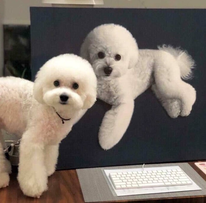 Когда твой питомец настолько фотогеничен, что заслуживает портрета в стиле профессиональной студийной съемки! Автор не просто нарисовал своего белоснежного щенка — он создал почти фотореалистичную копию с той же милой прической-шариком. Теперь у собаки есть собственная галерея, и она явно знает, что она звезда. Следующий шаг — открыть портретную студию для домашних животных, потому что талант налицо (и на холсте)!