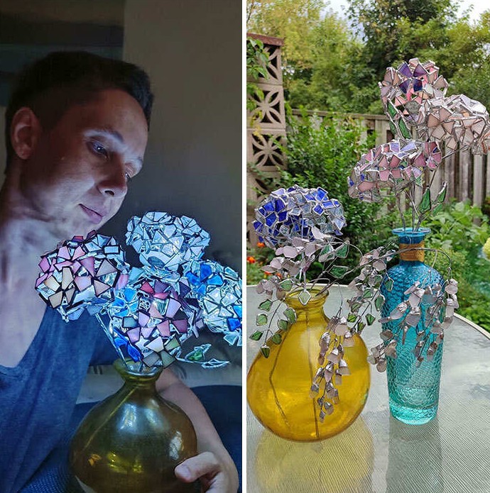 От хобби «посмотрю пару видео на YouTube» до создания витражных шедевров — именно такой путь прошел автор этих потрясающих гортензий. Каждый лепесток вырезан и спаян вручную, превращая цветное стекло в нежные соцветия, которые ловят свет и наполняют комнату радужными бликами. Это уже не просто декор — это функциональное искусство, которое не завянет и будет радовать круглый год. Соседские живые гортензии нервно курят в сторонке!