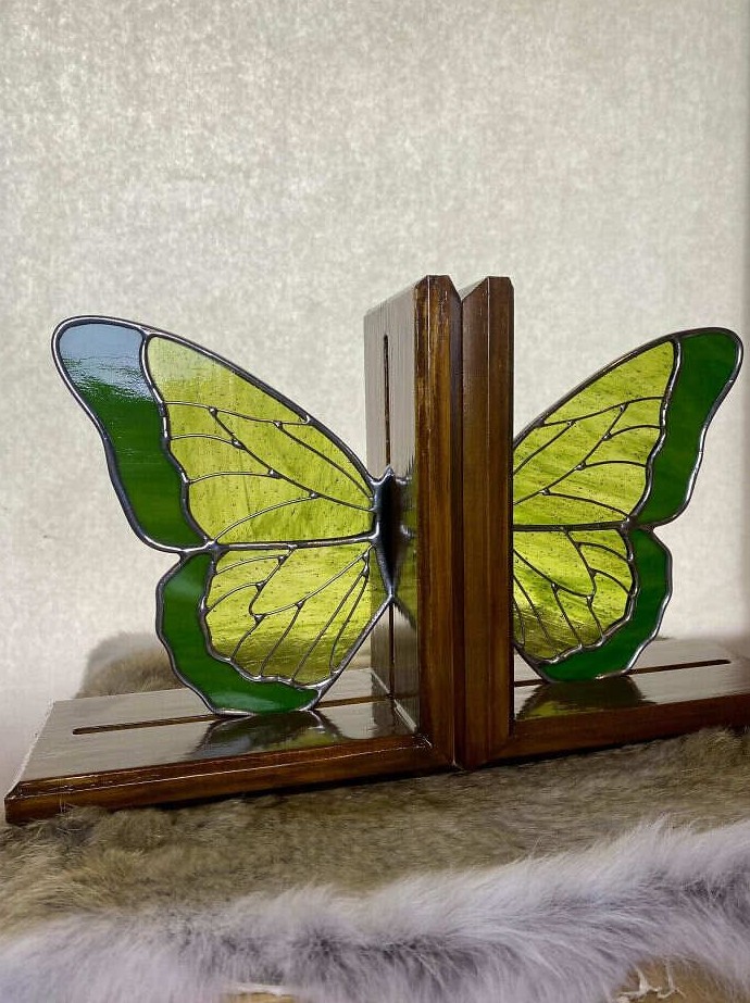 Эти книжные подставки не просто держат книги — они превращают вашу полку в ботаническую оранжерею! Каждое крыло бабочки выполнено из цветного стекла, создавая игру света и цвета, которая меняется в течение дня. Автор доказывает, что функциональные предметы могут быть невероятно красивыми, а витраж — это не только для церковных окон. Теперь даже самые скучные учебники будут выглядеть как часть арт-инсталляции!