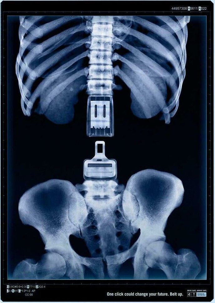 Один клик может изменить ваше будущее. Пристегнись.» — рентгеновский снимок как метафора последствий. Эта кампания использует медицинскую образность, чтобы показать: ремень безопасности буквально держит вас целым. Когда социальная реклама попадает точно в цель, не нужно много слов — изображение говорит само за себя.